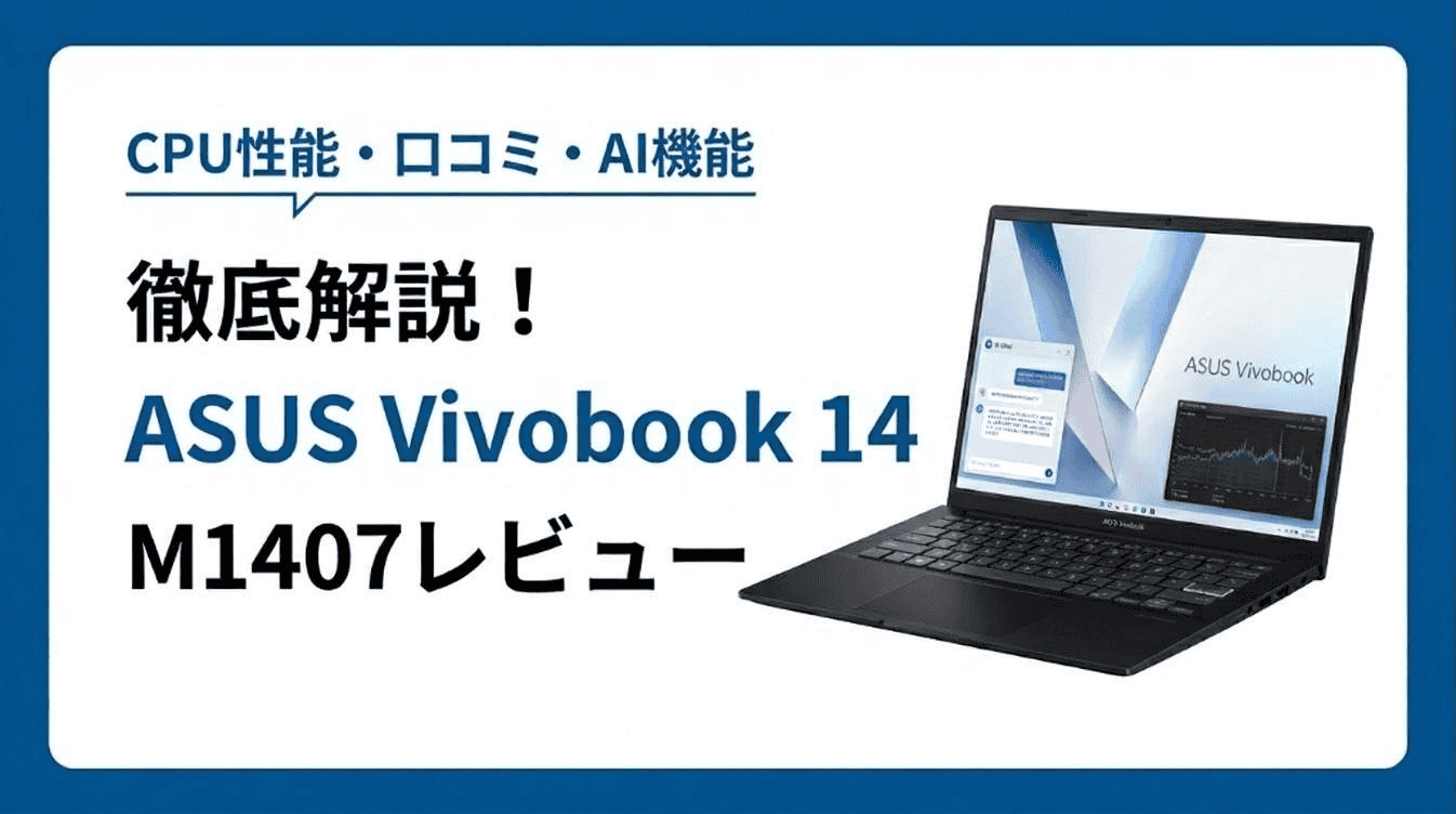 この記事では、搭載CPUのベンチマークスコアから実際のユーザーの口コミまで、あらゆる角度からASUS Vivobook 14 (M1407)を掘り下げていきます。同じASUSストアで販売されている他モデルとの比較や、ASUSブランドの特徴・評判も交えながら、購入を検討している方が「自分に合うかどうか」を判断できるよう、できるだけわかりやすくまとめました。