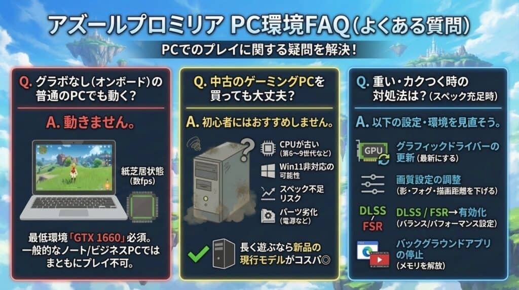 アズールプロミリアは推奨スペックが高め(特にCPUとメモリ)です。安価な中古PCは、CPUが古く(第6~9世代など)、Windows 11に対応していない場合や、スペック不足になる可能性が高いです。また、電源ユニットなどの劣化リスクもあります。長く遊ぶなら新品の現行モデルが最もコスパが良いです。