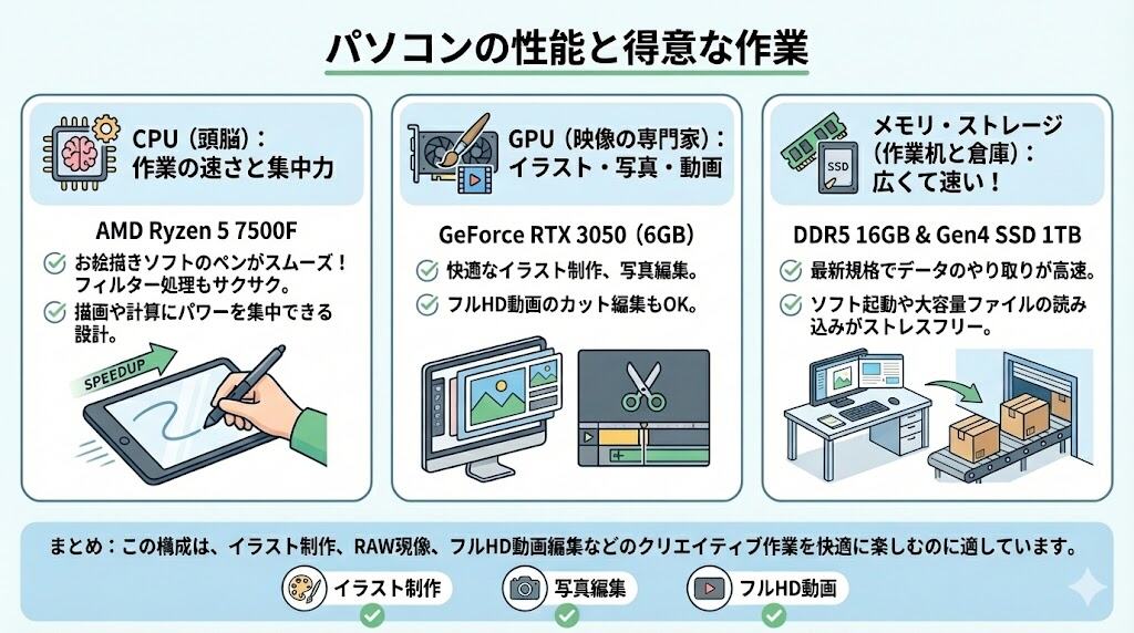 本機がこの価格を実現できている理由は、搭載パーツの絶妙な組み合わせにあります。CPUには、映像出力機能を省くことでコストを下げつつ高い処理能力を持つ「AMD Ryzen 5 7500F」を採用。そこにエントリークラスのGPU「GeForce RTX 3050」を組み合わせることで、クリエイティブ作業に必須のグラフィック性能を確保しています。