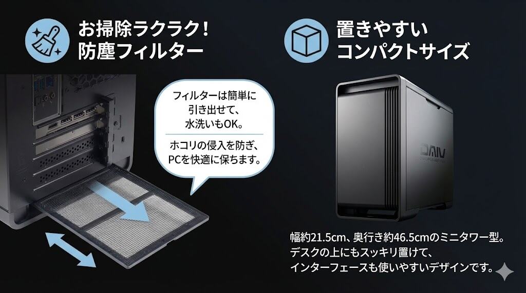 ホコリが溜まりやすいケース底面の吸気口には、取り外しと水洗いが可能な防塵フィルターが設置されています。パソコンの大敵であるホコリの侵入を防ぎつつ、掃除が簡単に行える点は、PCの寿命を延ばす上で非常に大きなメリットです。