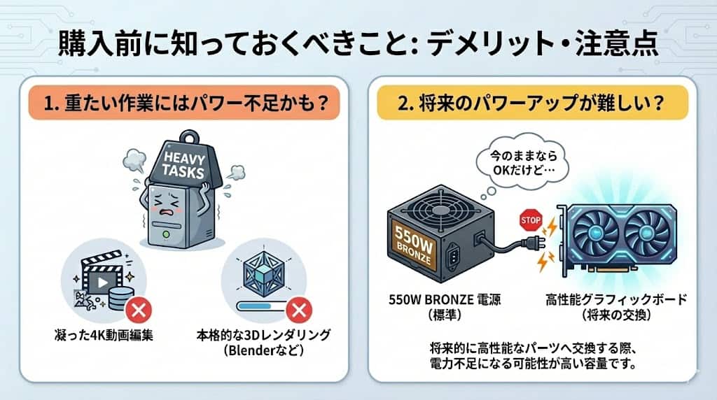 本機は万能ではありません。特に「4K動画の凝った編集」や「Blenderなどでの本格的な3Dレンダリング」にはパワー不足です。