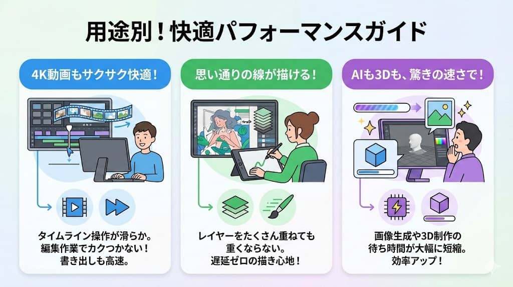 イラストレーターや漫画家の方にとって、このモデルはまさに「最適解」の一つです。Clip Studio Paintで高解像度のキャンバスを開き、多数のレイヤーを重ねても、Ryzen 5 7500Fの高いシングルスレッド性能のおかげで、ブラシの遅延を感じることなく描画できます。