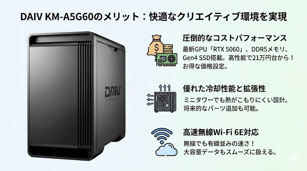 DAIV KM-A5G60は、最新のRTX 5060とRyzen 5という強力なパーツを組み合わせつつ、無駄を削ぎ落とすことで21万円台という驚異的なプライスを実現した意欲作です。