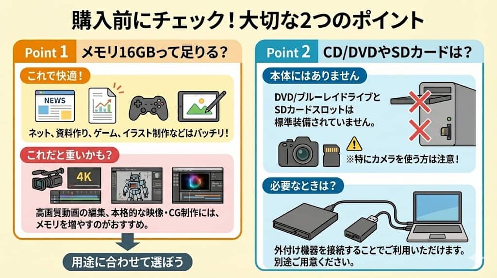 クリエイティブソフトはメモリを大量に消費するため、予算に余裕があれば購入時のカスタマイズで32GB(16GB×2)にアップグレードすることをおすすめします。後から自分で増設することも可能ですが、最初から増やしておいたほうがトラブルなく快適に作業をスタートできます。