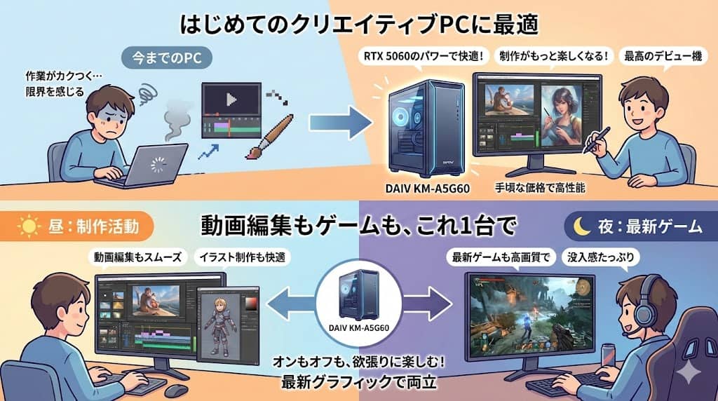 「今まで普通のノートPCで作業していたけど、限界を感じている」という方に、DAIV KM-A5G60は最高のデビュー機になります。RTX 5060のパワーがあれば、今までカクついていた作業が嘘のようにスムーズになり、制作の楽しさが倍増すること間違いありません。価格もハイエンド機に比べれば手が届きやすく、入門機としては破格の性能を持っています。