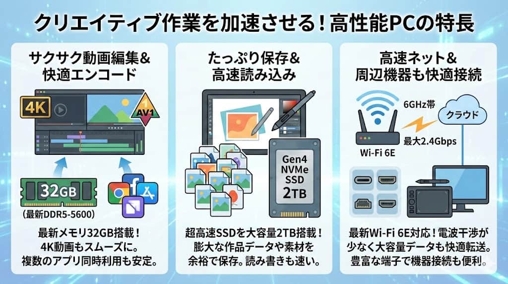 - 最新規格を長く使いたい方:Wi-Fi 6E、AV1エンコード、DDR5メモリなど、将来性のある規格を揃えておきたい方。
