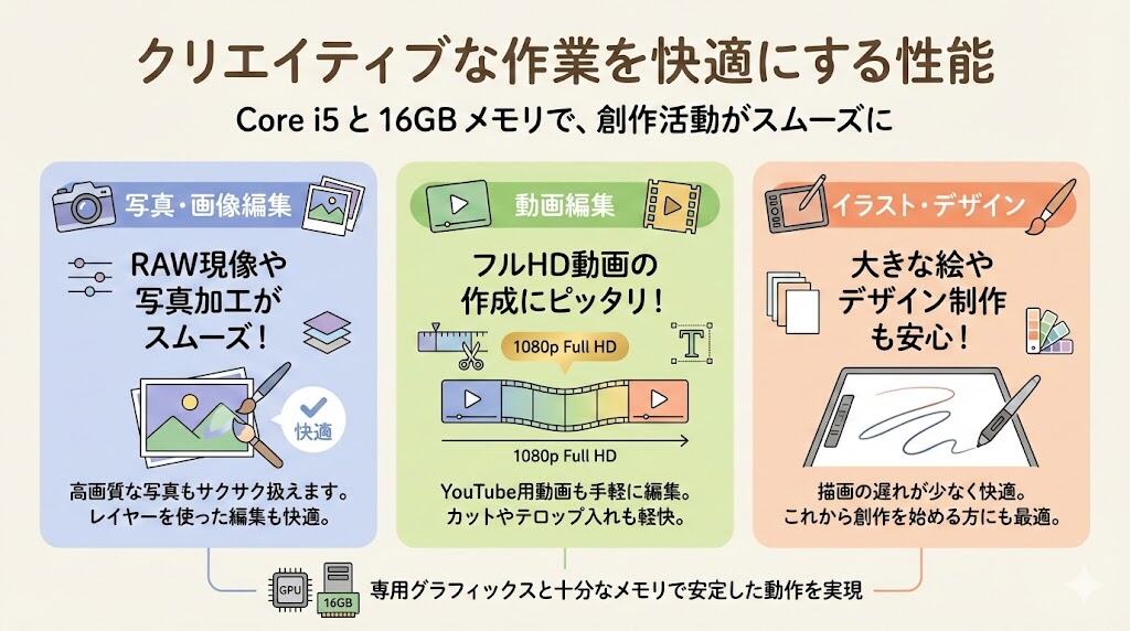 Adobe Premiere Proなどを使用した動画編集については、フルHD画質(1080p)の編集に最適なスペックと言えます。YouTube向けの動画制作や、カット編集、テロップ入れといった作業は非常にスムーズに行えるでしょう。