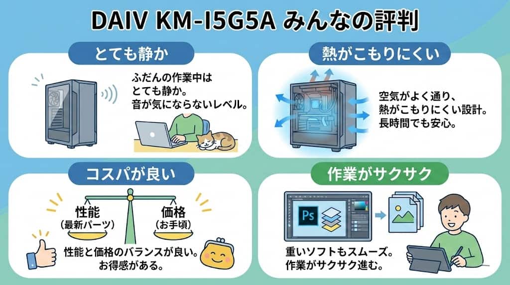 多くのユーザーが挙げているのが「静音性の高さ」です。DAIVのケースはエアフローが最適化されており、負荷がかからない作業時はファンの音が気にならないほど静かだという意見が見られます。