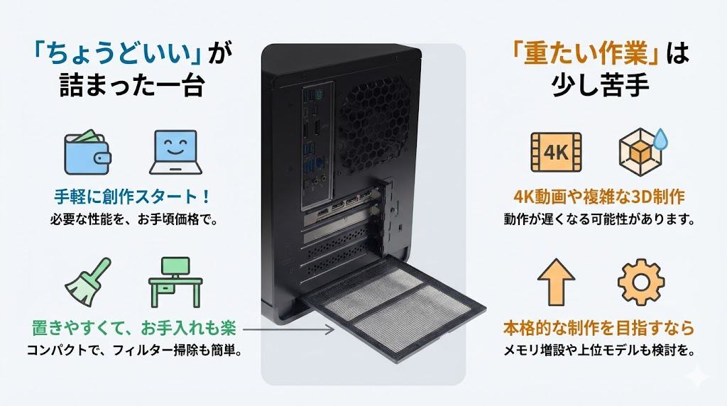 最大のメリットはやはりコストパフォーマンスです。プロ向けのハイエンド機は非常に高価ですが、本機は「多くの人が必要とする性能」に絞ることで、手頃な価格を実現しています。これから本格的に創作活動を始めたい方にとって、無駄のない投資ができるモデルです。