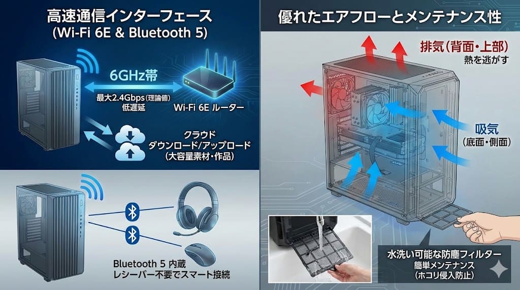 また、底面には水洗い可能な防塵フィルターが設置されており、ホコリの侵入を防ぎつつ、メンテナンスも簡単に行えます。パソコンの大敵であるホコリを簡単に掃除できる点は、長く愛用する上で非常に重要なポイントです。