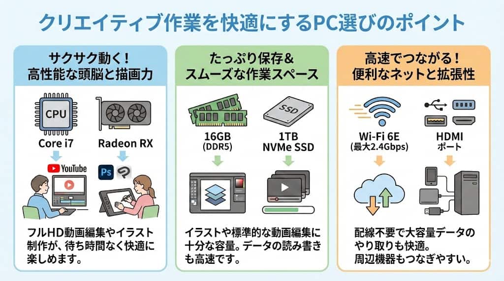 予算に少し余裕があれば、購入時のカスタマイズ(BTO)でメモリを32GBに増設することをおすすめします。これにより、作業の安定性がさらに向上し、より長く快適に使用できるようになります。また、動画素材を大量に保存する予定がある場合は、HDDなどのセカンドストレージの追加も検討すると良いでしょう。