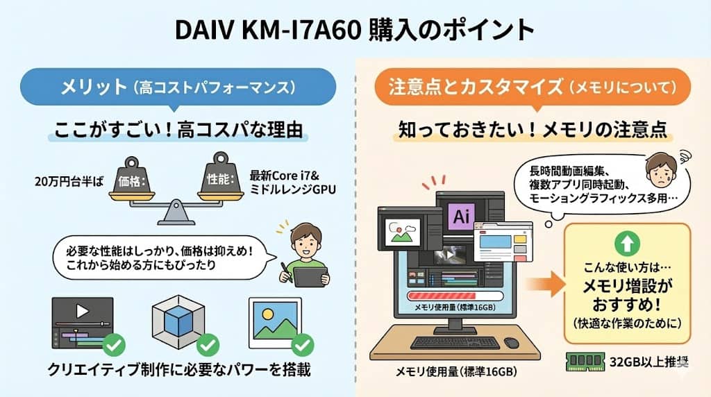 総合的に見て、DAIV KM-I7A60はどのような点が優れており、購入時にどこに注意すべきか、メリットとデメリットを整理します。