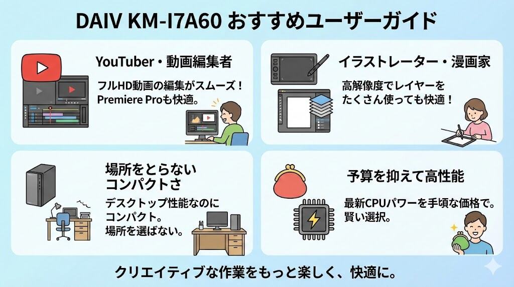 ここまでの分析を踏まえると、DAIV KM-I7A60は以下のようなユーザーに特におすすめです。