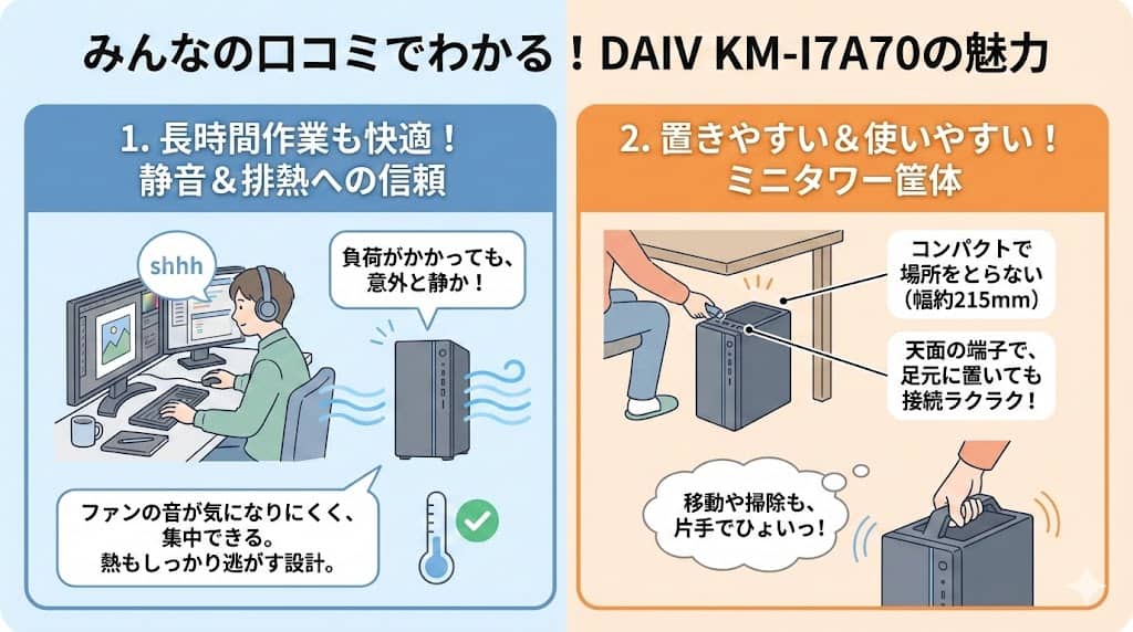 DAIV KMシリーズのユーザー評価でよく挙がるのが「負荷がかかった時の音が意外と静か」という点です。