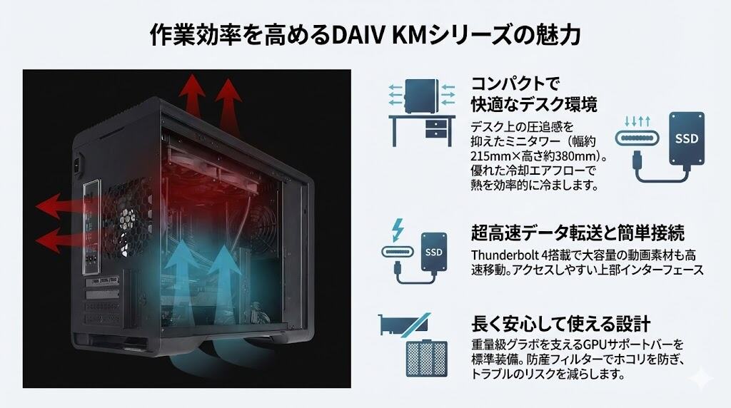 DAIV KMシリーズの魅力は、そのサイズ感にもあります。フルタワーに比べてコンパクトなミニタワーケース(幅約215mm×奥行き約465mm×高さ約380mm)を採用しており、デスクの上に置いても圧迫感が少なめです。