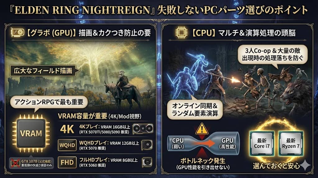 『ELDEN RING NIGHTREIGN』のためにBTOパソコンをカスタマイズする際、特に注目すべきパーツの選び方を解説します。