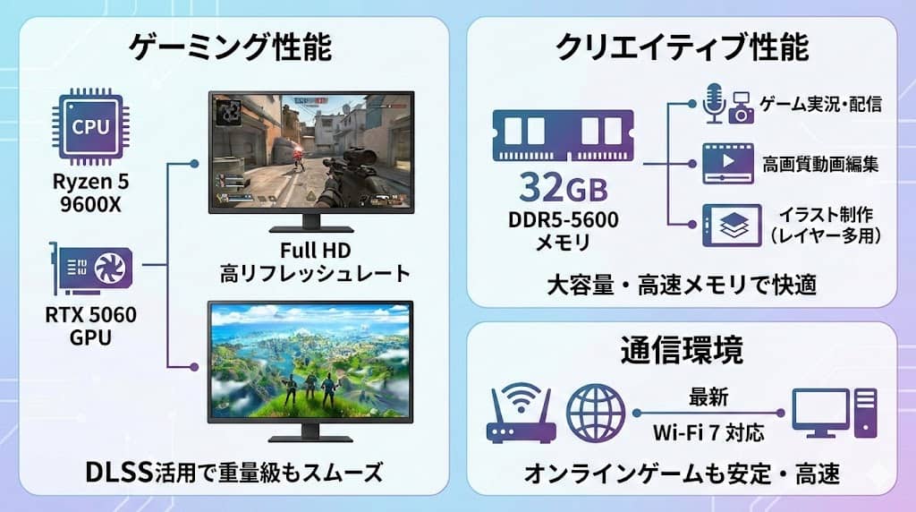 Ryzen 5 9600XとRTX 5060の組み合わせは、現在主流のFPSやバトルロイヤルゲームにおいて、高リフレッシュレートでのプレイをターゲットにしています
