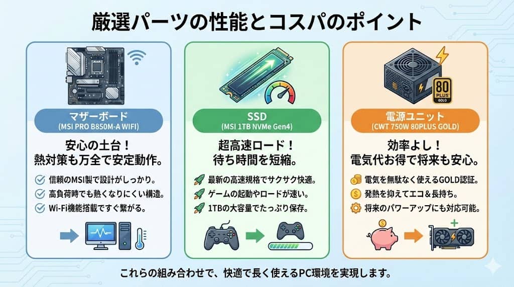 ツクモのG-GEARシリーズが長年評価されている理由の一つに、採用パーツの品質の高さがあります。
