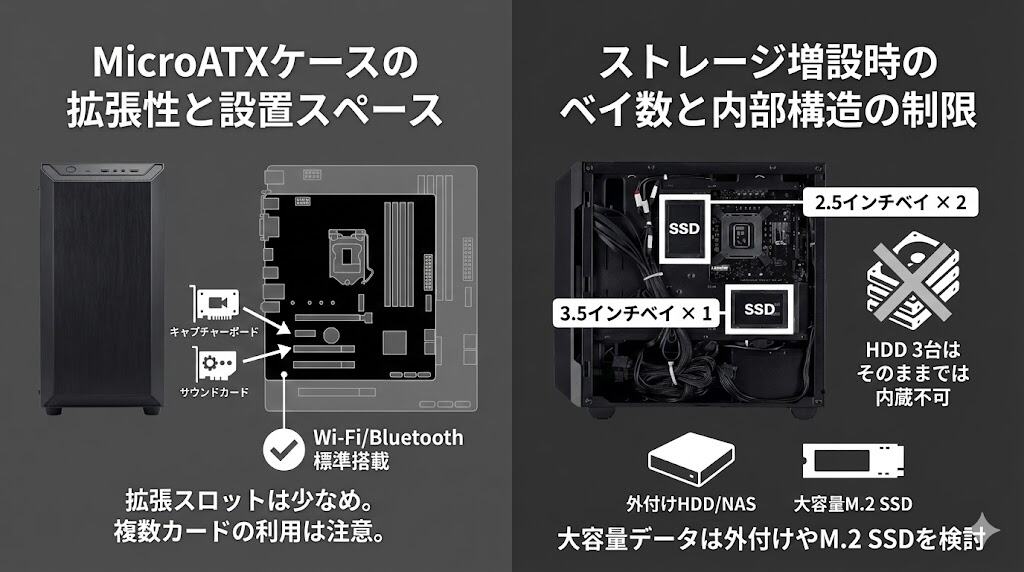 「手持ちのHDDを3台内蔵したい」といったニーズにはそのままでは応えられません。大量のデータを保存する場合は、外付けHDDやNASの活用、あるいは大容量M.2 SSDへの換装を検討するのがスマートです。