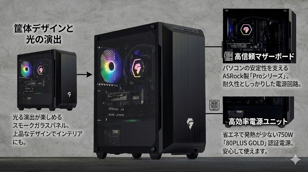一般的なゲーミングPCは巨大なケースが多いですが、このモデルはミニタワーサイズで非常にコンパクト。それでいて、内部レイアウトが工夫されているため、大型のグラフィックスカードや水冷クーラーが無理なく収まっています。「場所は取りたくないけれど、性能には妥協したくない」という日本の住宅事情にマッチした、非常にバランスの良い設計と言えます。