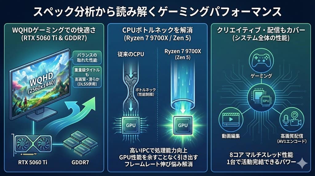 RTX 5060 TiとGDDR7メモリの組み合わせは、WQHD(2560×1440)解像度でのゲーミングにおいて最もバランスの取れた性能を発揮すると予測されます。