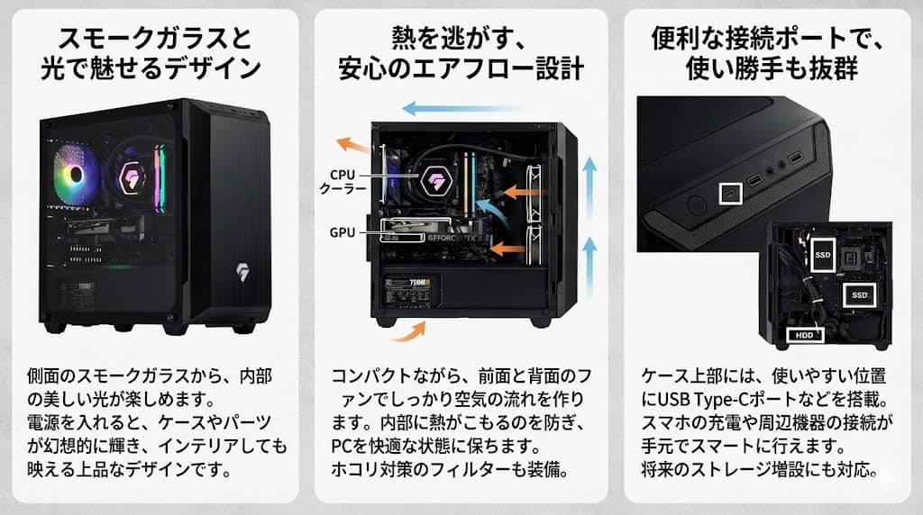 コンパクトなケースで懸念される「熱」の問題に対しても、しっかりとした対策が施されています。ケースの前面と背面に標準搭載されたファンが、スムーズな空気の流れ(エアフロー)を生成し、内部に熱が留まるのを防ぎます。