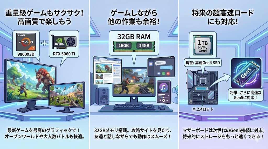 Ryzen 7 9800X3DとRTX 5060 Tiの組み合わせであれば、現在流通しているほぼすべての重量級ゲームタイトルを高設定で楽しむことができます。特にCPU負荷の高いオープンワールド系RPGや、大規模人数のバトルロイヤルゲームなどでその真価を発揮します