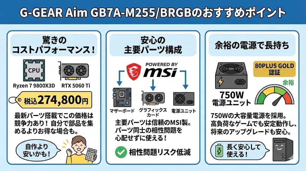 G-GEAR Aim GB7A-M255/BRGBの評判は?Ryzen 7 9800X3DとRTX 5060 Ti搭載の次世代機を分析