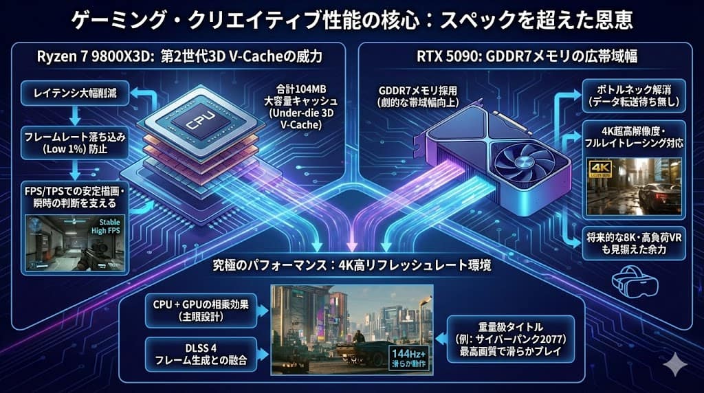 Ryzen 7 9800X3Dの最大の特徴は、合計104MBにも及ぶ大容量キャッシュメモリをCPUダイの下に配置する「第2世代AMD 3D V-Cacheテクノロジ」です。これにより、CPUとメモリ間のレイテンシが大幅に削減され、フレームレートの落ち込み(Low 1%)を防ぐ効果が期待できます。