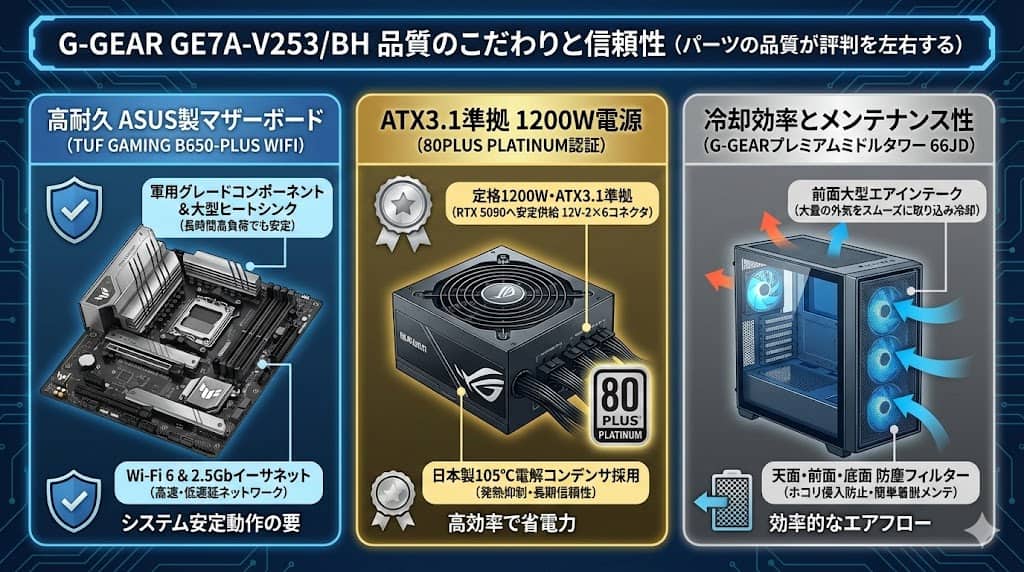 BTOパソコンの評判を左右するのは、主要スペックだけでなく、システムを支えるマザーボードや電源などの品質です。G-GEAR GE7A-V253/BHに採用されているパーツの信頼性を確認します。