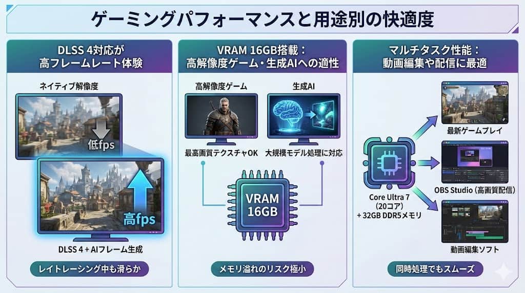 また、Stable Diffusion等の画像生成AIをローカル環境で動作させる際、VRAM容量は生成解像度や学習速度に直結します。GDDR7の高速なアクセス速度と十分な容量を備えた本機は、ゲーミング以外のAI活用においても快適な操作感が見込めます。