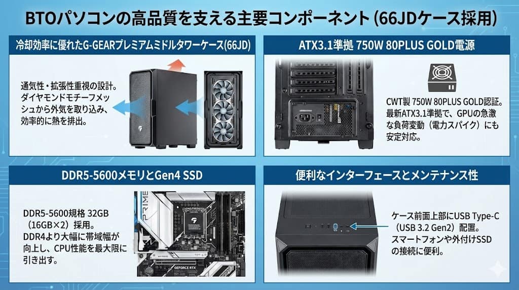 BTOパソコンとしての品質を支える、ケースや電源、メモリ周りの仕様についても詳しく見ていきます。