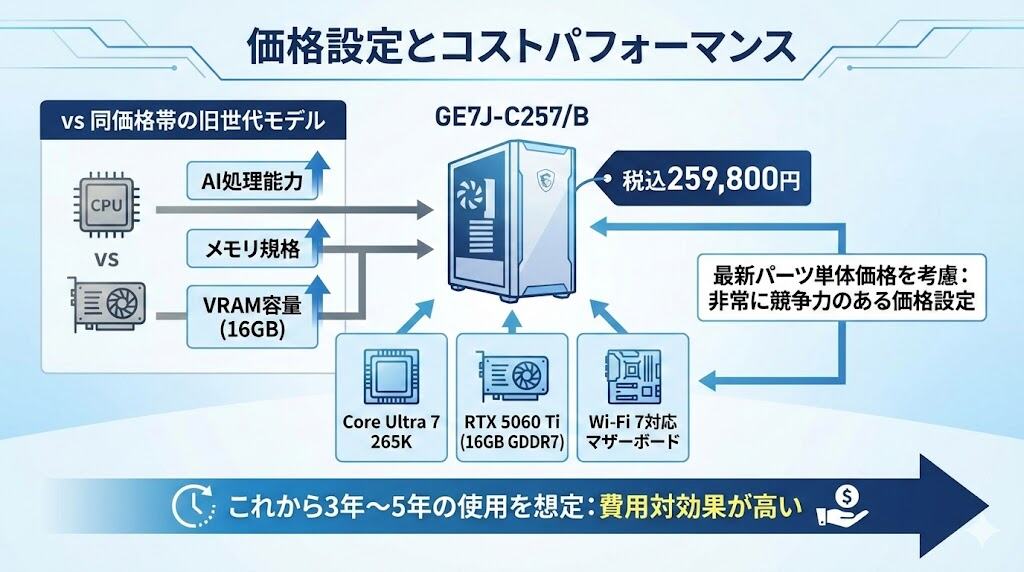 GE7J-C257/Bの販売価格は税込259,800円となっています。搭載されているCore Ultra 7 265K、RTX 5060 Ti (16GB GDDR7)、Wi-Fi 7対応マザーボードといった最新パーツの単体価格を考慮すると、非常に競争力のある価格設定です。