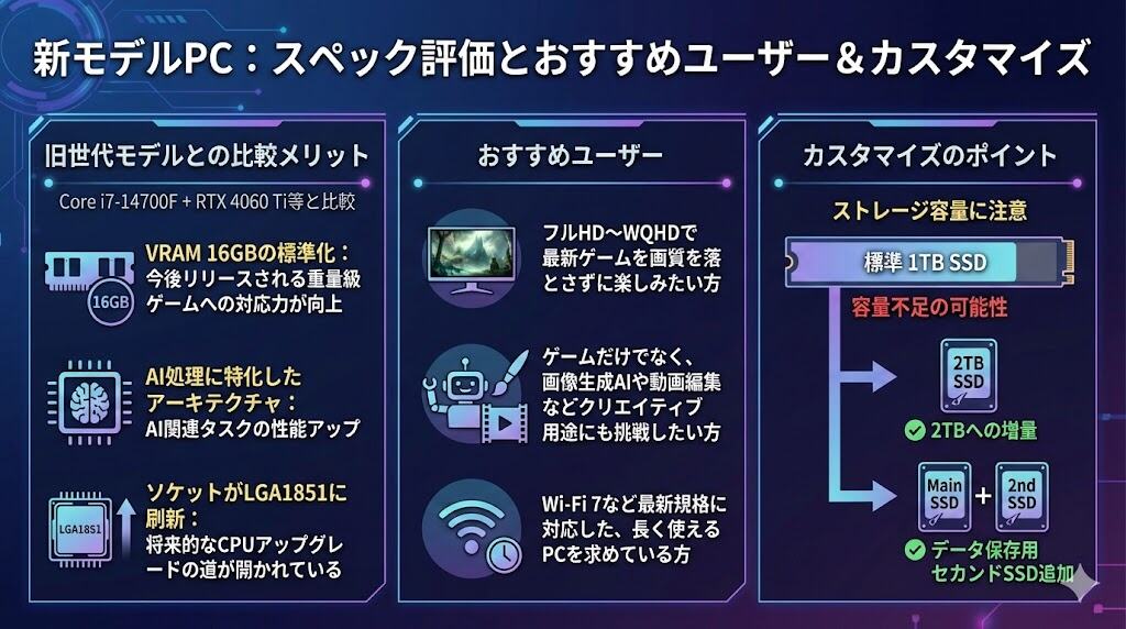 前世代(Core i7-14700F + RTX 4060 Ti等)と比較すると、最大のメリットは「VRAM 16GBの標準化」「AI処理に特化したアーキテクチャ」です。これにより、今後リリースされる重量級ゲームタイトルへの対応力が格段に向上しています。また、ソケットがLGA1851に刷新されたことで、将来的なCPUアップグレードの道が閉ざされていない点も安心材料です。