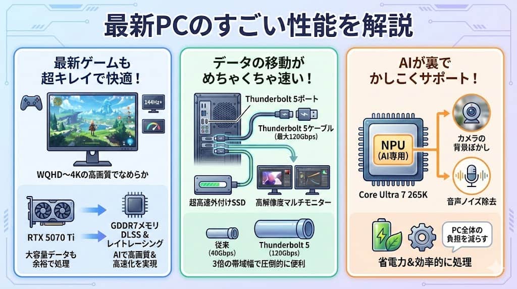 RTX 5070 TiとCore Ultra 7 265Kの組み合わせは、WQHD(2560×1440)から4K解像度でのゲーミングを快適に行うためのスペック水準を満たしています。