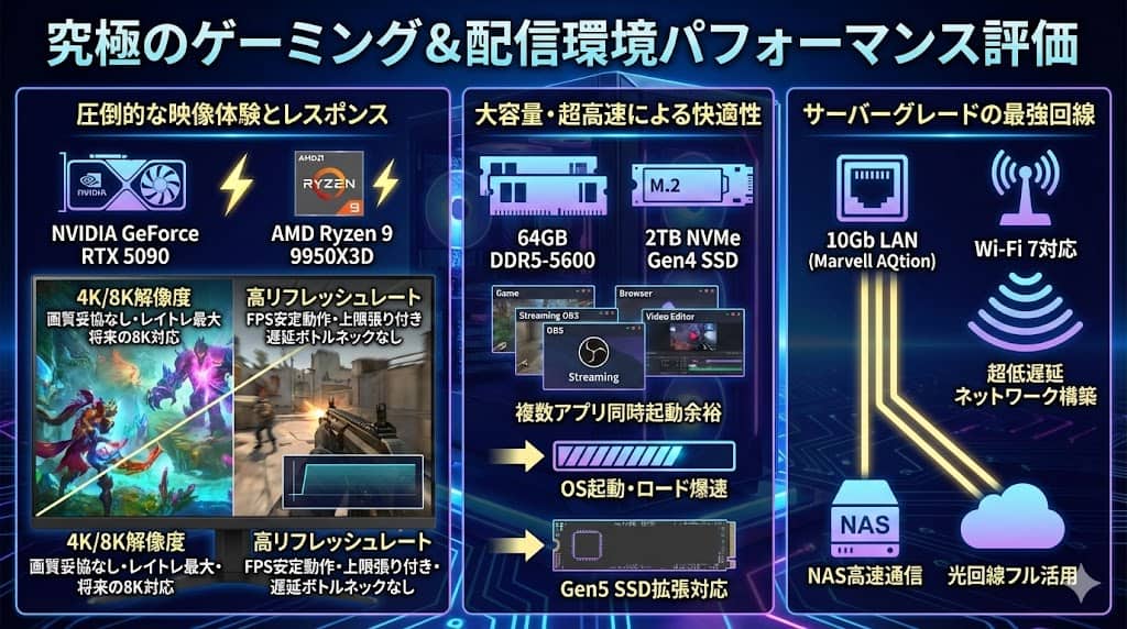 RTX 5090とRyzen 9 9950X3Dの組み合わせは、現在主流の4K解像度において、画質設定を妥協することなく高フレームレートを維持することを目的としています。特にレイトレーシングをフルに活用したタイトルや、将来的な8Kゲーミングの入り口としても十分な性能を有しています。