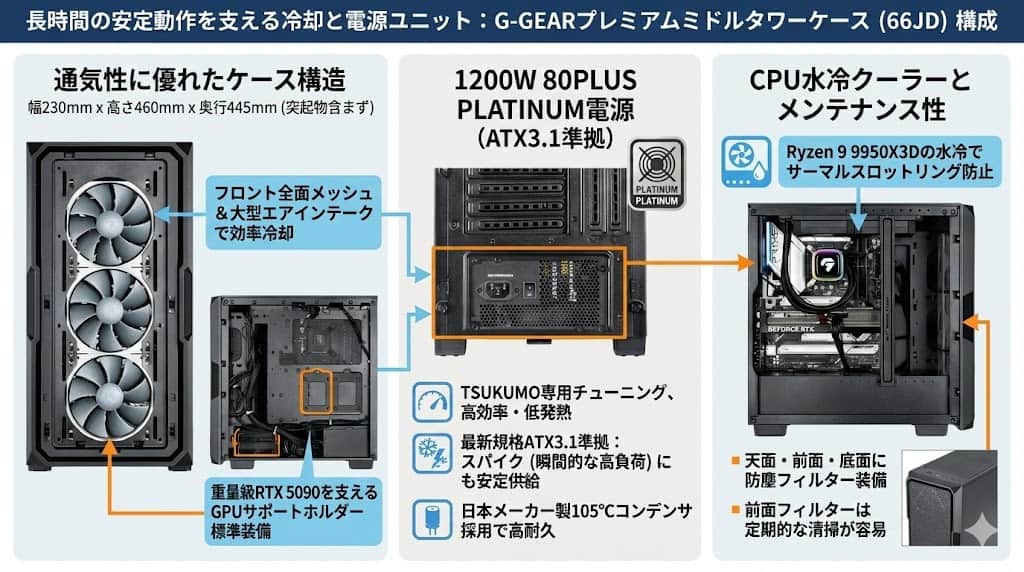 筐体には、評価の高いG-GEARプレミアムミドルタワーケース(66JD)が採用されています。フロントパネル全体がメッシュ構造となっており、大型のエアインテークから直線的に外気を取り込むことで、発熱の大きいハイエンドパーツを効率的に冷却します。
