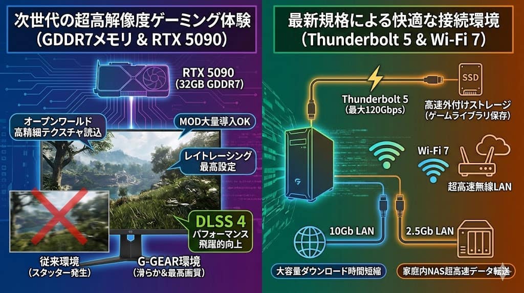 RTX 5090に搭載された32GBのGDDR7メモリは、オープンワールドゲームにおける高精細なテクスチャ読み込みにおいて絶大な威力を発揮します。VRAM容量が不足すると発生しやすいスタッター(カクつき)を未然に防ぎ、MODを大量に導入した環境や、最高設定のレイトレーシング環境でも滑らかな描画を維持します。