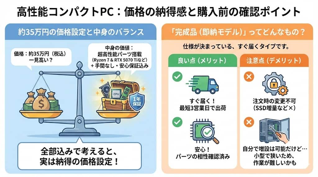 スペックの高さは魅力的ですが、購入を検討する上で重要な価格設定と、完成品モデルならではの特徴について整理します。