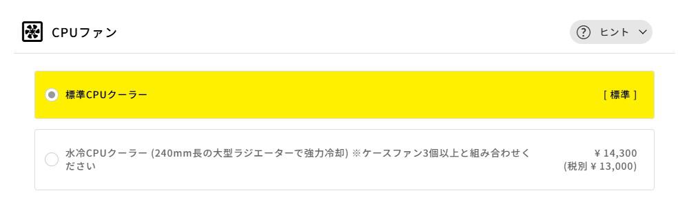搭載されているCPUは発熱が穏やかなため、基本的には「標準CPUクーラー」のままで問題なく動作します。 より静かな環境や強力な冷却を求める場合は「水冷」も選べますが、追加で14,300円かかります。特にこだわりがなければ標準を選び、浮いた予算を他のパーツや周辺機器に回すのがおすすめです。