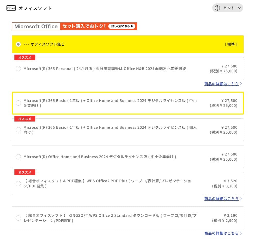 仕事や学校でWordやExcelが必須でない限り、「オフィスソフト無し」で十分です。 必要な場合は、Microsoft 365 Personal(24か月版)やOffice Home and Business 2024などの選択肢がありますが、Amazonなどで後から単体購入する方が安い場合もあります。 安価な互換ソフト「WPS Office 2」もありますが、Microsoft純正との完全な互換性はないため注意が必要です。