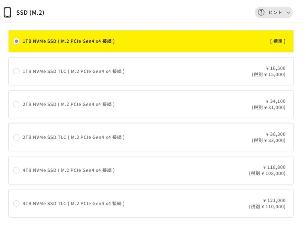 標準の「1TB」で、大型ゲームを複数インストールしても十分な余裕があります。 容量を増やす「2TB」への変更はプラス34,100円とかなり高額です。最初は標準のまま購入し、将来足りなくなったら安価な外付けSSDなどを買い足す方が、お財布に優しくおすすめです。