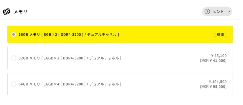 ゲーム用途なら標準の「16GB」で快適に動作します。 動画編集や配信を本格的にしたい場合は32GBあると安心ですが、カスタマイズ費用が45,100円と非常に高額です。 どうしても容量が必要な場合以外は、標準のまま購入するのがコストパフォーマンス的に賢い選択です。