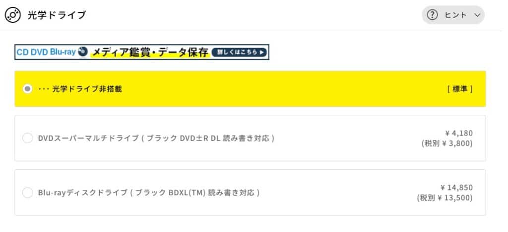 最近はゲームやソフトの入手もダウンロードが主流なため、基本的には「非搭載」のままで困りません。 手持ちの音楽CDを取り込んだり映画DVDを見たい場合は追加も可能ですが、4,180円以上の費用がかかります。使用頻度が低いなら、必要な時だけ接続できる市販の「外付けドライブ」を後から購入するのも一つの手です。