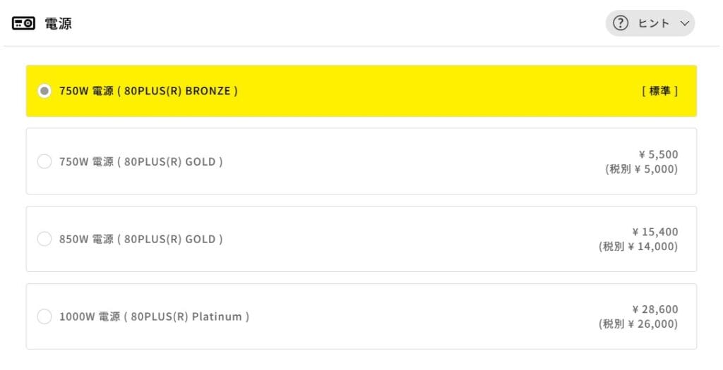 標準の「750W」で容量は十分足りています。 もし予算に余裕があれば、プラス5,500円で「750W GOLD」に変更するのもおすすめです。電気の変換効率が良くなり、省エネ効果やパソコンの長持ちにつながりますが、迷ったら標準のままでも全く問題ありません。