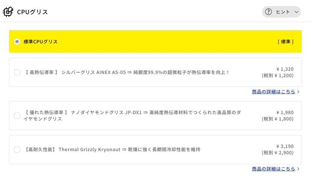 標準でも動作に問題はありませんが、搭載している高性能CPUは熱を持ちやすい性質があります。+1,320円などで選べる「シルバーグリス」などに変更すると、熱を効率よく逃がしてパソコンへの負担を減らせます。後から自分で塗り直すのは大変な作業なので、長く大切に使いたいなら、注文時にグレードアップしておくのが賢い選択です。
