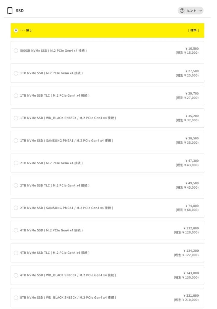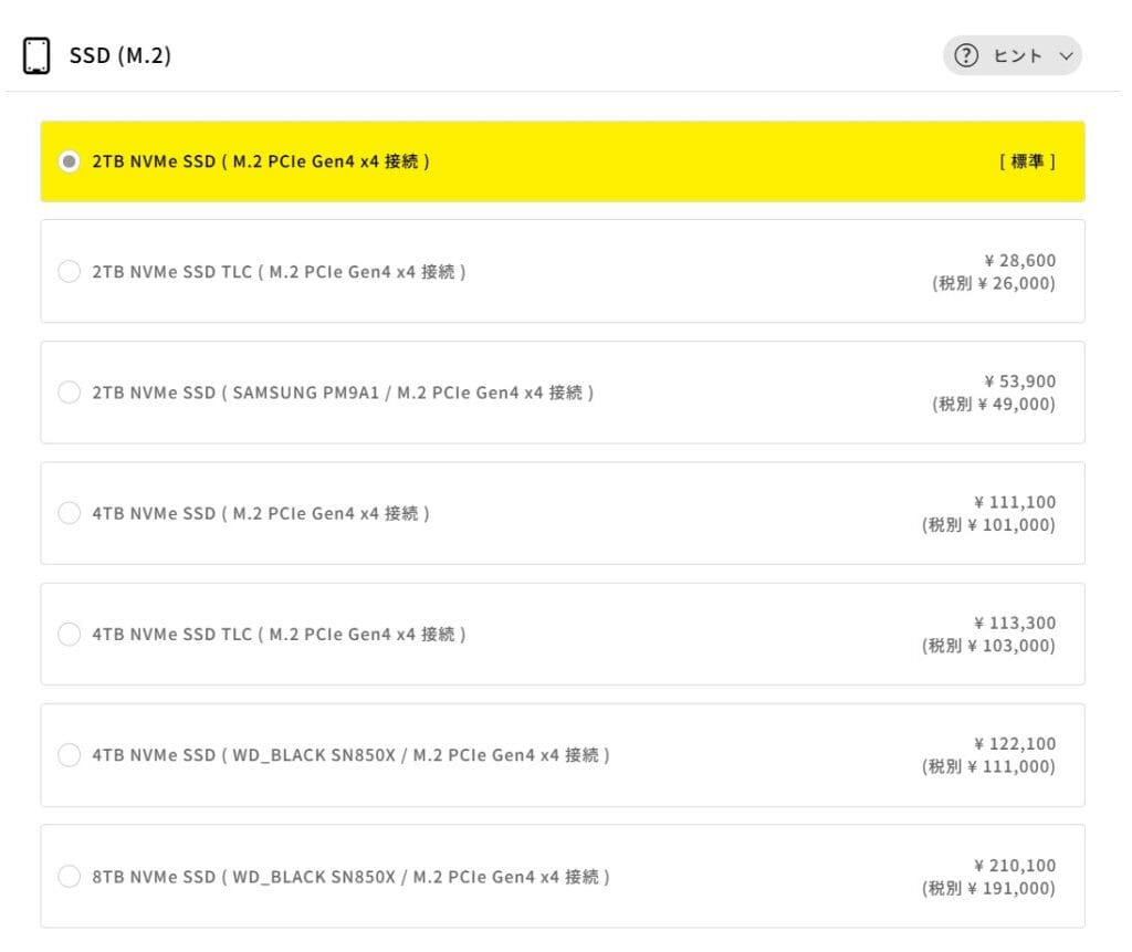メインの保存場所として既に2TBの大容量があるため、ここでの追加は基本的に「無し」で大丈夫です。動画編集などで大量のデータを保存する予定がある方以外は必要ありません。もし将来容量が足りなくなっても、後から簡単に取り付けられる「外付けSSD」などで対応できるので、最初は追加費用をかけなくてOKです。