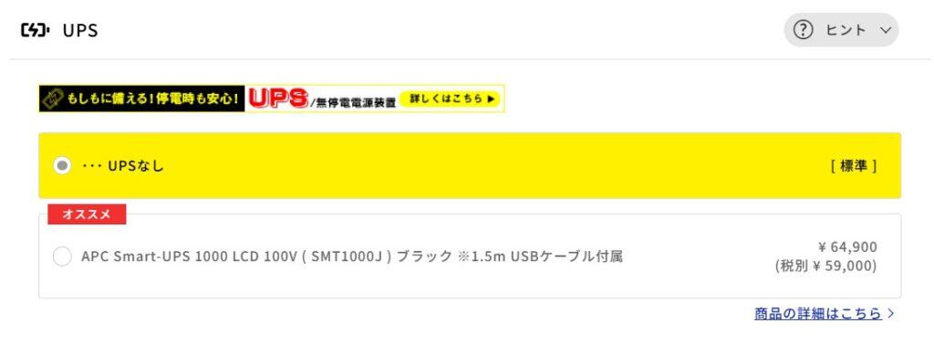 停電などの急な電源トラブルからパソコンを守る装置です。高額なオプションなので、一般家庭でのゲームや趣味の利用なら「なし」で問題ありません。絶対に消えては困る仕事のデータを扱っている場合や、落雷や停電が多い地域にお住まいの方以外は、追加しなくて大丈夫です。
