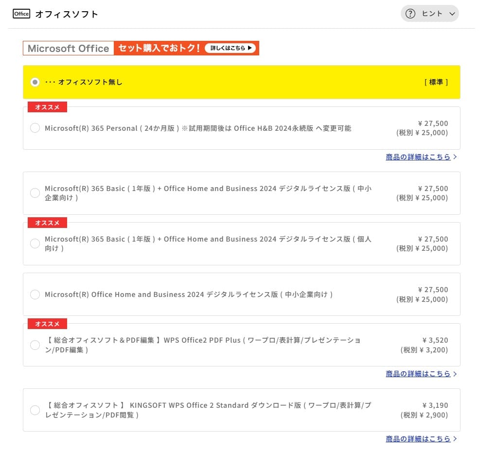 WordやExcelを使う予定がなければ「無し」でOKです。すでにアカウントを持っている場合も不要です。仕事や学校で必要な場合のみ追加しましょう。コストを抑えたい場合は互換ソフトの「WPS Office」もありますが、迷ったらMicrosoft製を選ぶのが安心です。