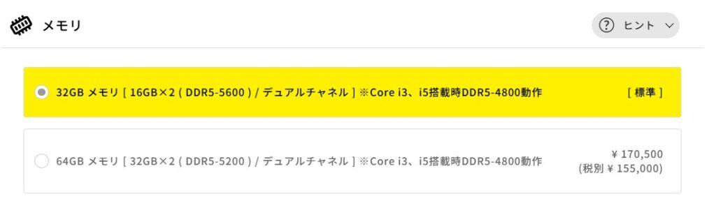 標準で「32GB」の大容量を搭載しており、多くのゲームや動画編集が快適に動作します。64GBへの変更も可能ですが、追加費用が約17万円と非常に高額です。一般的な用途で32GBを使い切ることはほとんどないため、コストを抑えるためにも標準のままで全く問題ありません。